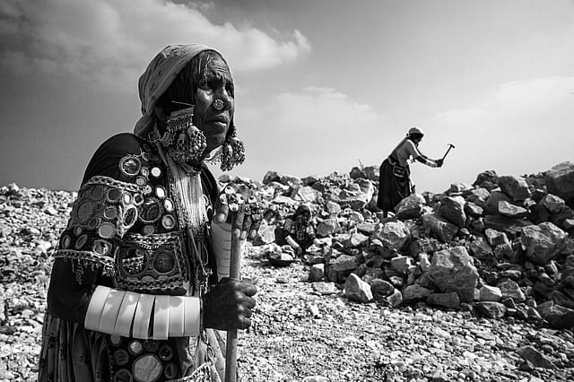 Two women from the Banjara community stand in the frame, surrounded by rocks and rubble. One of them gazes into the distance, the other in the background hammers her way through her task—her tools dwarfed by the enormous landscape around her.