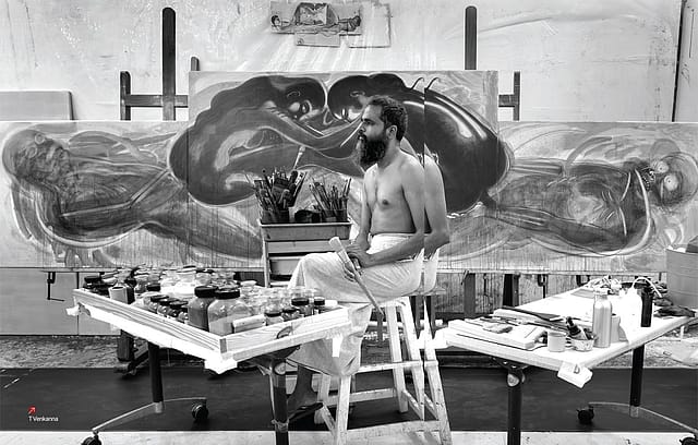 T VENKANNA IS A model of stillness. A paintbrush in hand, surrounded by paints and pigments, he sits in his Hyderabad studio looking away from the camera. Behind him looms one of his works of art whose intensity seems almost at loggerheads with its creator. Four figures locked in coitus—men splayed out, thrusting themselves into women who in turn sink into each other’s arms—evoke a scene where sex is the patina coating something far more violent. As with much of Venkanna’s sexually-charged art, it compels the viewer to keep looking just as much as it makes them want to turn away.