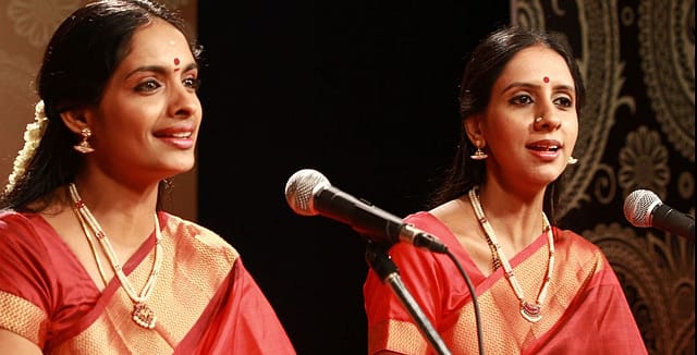 When they perform, they dress like a duet, complementing each other’s colours. One arrives in a deep tone, the other in its answering shade. Onstage they do not sing as mirrors but as counterweights. One voice leans toward bhāva and contour, the other toward sparkle and propulsion, so that the music keeps correcting itself in real time. An alapana begins in one register and is finished and even contradicted by the other. This responsiveness is part of what travels well online. They are also stars on social media—a quick raga sketch, a clean lift into neraval or swara, percussion locking in, the hall answering back. Their own social feeds lean into pedagogy as much as performance.