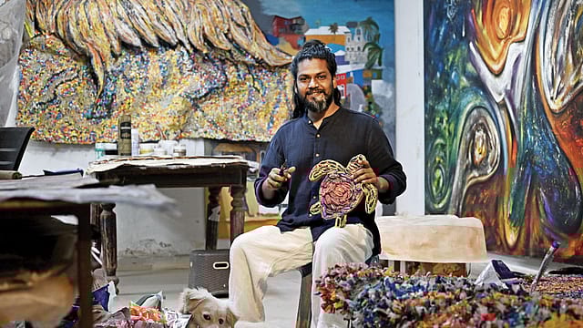 To breathe new life and accord purpose to a discarded item is the mark of a true creator. No wonder then that visual artists are drawn to recycling waste materials, found objects and their own dismantled works. While Dixit finds her art meditative, Manveer Singh aka Plasticvalla, finds purpose in his practice. As a child, Singh never had money for store-bought toys and other items, so he crafted himself kites, clay cars and other objects. This hands-on approach made him an artist. In 2018, he began creating art from plastic when he learnt that ragpickers, who search dump yards for salvageable items, consistently overlook multi-layered plastics (MLP), which then accumulate in landfills. “This realisation impacted me deeply. No one wanted to touch this material that was contributing significantly to environmental degradation. I decided to transform these into art sculptures, compelling viewers to confront what society often ignores,” he explains.