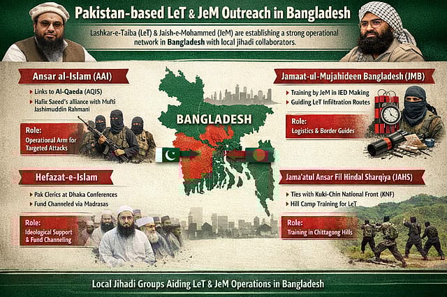 Of late, Pak-based groups like LeT are seeking to move beyond mere outreach towards establishing a robust operational network in Bangladesh. This is being facilitated by a cluster of local jihadi groups: i) Ansar al-Islam can act as the operational arm for targeted strikes in future; ii) Neo-JMB provides cross-border logistics and IED expertise; iii) Hefazat-e-Islam offers ideological legitimacy and a channel for foreign funding; and iv) Jama'atul Ansar Fil Hindal Sharqiya (JAHS) secures remote training facilities in Chittagong Hill Tracts. Pertinently, both AAI & JMB are already active in India, especially in Assam & West Bengal. Together, these groups have the potential to transform Bangladesh into a strategic launchpad for terror activities by Pak-based groups like the LeT & JeM in future.