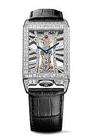 The Golden Bridge Rectangle watch enriches Corum’s unique and emblematic This avatar is enhanced with a engraved movement. The finely crafted geometry is visible in the 18-karat gold structures representing six Roman numerals surround the visible hand-wound calibre. The 18kt white gold, sapphire case middle, double antireflective sapphire, sapphire case back has 69 baguette-cut diamonds, and 118 full-cut diamonds and comes with a Black Alligator strap.