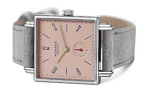 Nomos Square watch comes in four beautiful colours and share the name with the classic French pastry and make a delicious impression. These watches are powered by caliber Alpha, renowned for its reliability and accuracy traditionally hand crafted The hand-wound calibre with a power reserve of 43 hours can be viewed at work through a sapphire crystal glass back. This Pink Tetra Pearl watch comes with a velour leather grey strap.