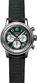 To commemorate the 30th anniversary of Chopard and Mille Miglia — a new collection comprising of five Mille Miglia Racing Colours watches were introduced. Each watch is allocated a colour to the nation competing in motor racing. The Green Dial is attributed to British Racing. The slim cursive font on the dial is inspired by the dashboards of the 1920s. The 42 mm chronograph is limited to 300-pieces. The Calfskin leather strap with rubber lining is inspired by 1960s Dunlop tyre tread.