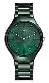 The Rado True Thinline is a beautiful fusion of nature and innovation. Inspired by verdant green of leaves it is set in high-tech ceramic in which Rado has expertise. The watch involves a unique dial treatment with a leaf structure, and green mother-of-pearl dial which shimmers. The bracelet has 3-row polished green high-tech ceramic with a titanium 3-fold clasp The case in polished green high-tech ceramic is water-resistant to 30m.