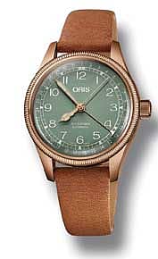 Oris Big Crown pointer date watch has a bronze version for people with a unique sense of style. The watch has a naturally ageing round bronze case and tapered lugs, coin-edged bezel, oversized crown and central pointer hand indicating the date. The Big Crown Pointer Date watch with a green dial is powered by a Swiss Made automatic movement. The watch is completed with a naturally tanned light brown leather strap.