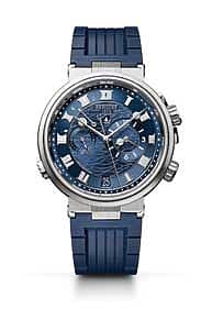 This Marine Alarme Musicale watch has a tita-nium case with fluted case band. The dial is a Sunburst blue dial white gold. The watch is wa-ter-resistant to 50 m,and numbered and signed by Breguet. The hours chapter are in Roman nu-merals and luminescent dots. An alarm is posi-tioned at the sub-dial at 3 o’clock and time-zone display at 9 o’clock. The self-winding movement has a 45-hour power reserve. The watch has an Alligator leather strap with folding clasp and is also available with a rubber strap.