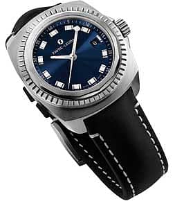 The Raider Sea King watch by Favre Leuba showcases versatility in form and functionality making it an indispensable tools for today’s explorers with new age performance innovation and bold retro-futuristic design. The design DNA is evident with the signature tetradecagon bezel, rectangular indices featured in the vintage Deep Blue watch. The dial is a deep royal oceanic blue. The 100m water resistant watch is held onto the wrist due to its comfortable lug drop. The watch comes with a soft antelope leather strap.