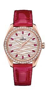 The Omega Seamaster Aqua Terra watch features a symmetrical 38 mm case crafted from 18K Sedna™ gold and includes a diamond-paved bezel. The dial has 12 marquise-cut red rubies as hour markers and has three different styles of horizontal waves symbolising the undulating rhythm of the ocean. The silvery guilloché waves are interspersed with waves in 18K Sedna™ gold as well as 18K Sedna™ gold waves which are paved with a total of 191 diamonds. The Seaaster is comes with a glossy red leather strap.