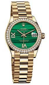 This classic iconic watch has redesigned case sides and lugs. This piece for ladies in 18 ct yellow gold is equipped with calibre 2236 which give a power reserve of 55 hours. This timepiece features a malachite dial with a Roman VI and IX in 18 ct yellow gold set with 24 diamonds. The bezel in 18 ct yellow gold comes set with 46 brilliant-cut diamonds.The Cyclops lens over the date with double anti-reflective coating makes the date clearly legible. The President Bracelet comes with three-piece solid links in 18 ct yellow gold, polished centre links with ceramic inserts.