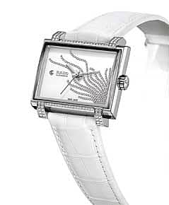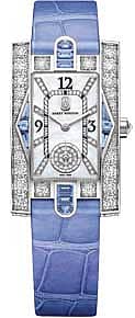 The Avenue Classic Aurora watch pays a tribute to the Art Deco style. The watch is adorned with 12 baguette-cut blue sapphires and has an 18-karat white gold case. The case has 50 brilliant-cut diamonds. The dial is in white mother-of-pearl dial and is printed with black Arabic numerals. The watch comes on an alligator leather strap that echoes the colour of the diamonds and sapphires.