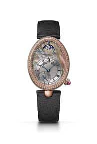 This new interpretation of the timeless classic, the Reine de Naples 8908 has a rose gold case which is set in 128 diamonds with the dial partly made from Tahitian mother-of-pearl and silvered gold. It has a moon phase and comes with a power-reserve indicator at 12 o’clock with a 45-hour power reserve and a beautiful Black satin strap with diamond-set folding clasp. The watch is also available with a rose gold bracelet.