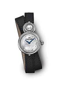 This 25 mm watch case comes in steel adorned with 41 diamonds. The interlaced curves form the number 8 – which is the signature figure of Jaquet Droz. The dial in mother-of-pearl is in the upper mobile loop. The case back is protected by sapphire glass, revealing part of the calibre JD 615, an automatic movement that brings the hour and minute hands to life on the dial and supplies a power reserve of 38 hours. The white mother-of-pearl dial has a circular grain motif and the Akoya pearl at 12 o’clock.