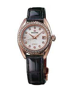 The new automatic Grand Seiko caliber for women comes in a limited edition of 50 pieces with 37 diamonds on the bezel. The new caliber is designed to offer a slim profile and a high performance level with a 50 hour power reserve. The watch has a sapphire case back to view the beauty of the new calibre. The strap of this watch is made of crocodile leather. The silver snow white dial is striking and subtle and the elegances is completed with silver lame. The case is in 18k rose gold case while the crocodile strap with three-fold clasp with push button release is in 18k rose gold.