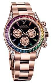 Rolex has introduced a scintillating gem-set version of the Oyster Perpetual Cosmograph Daytona. Created in first 1963, the watch has an extraordinary track record in the world of motor sport, rising to the rank of an icon. This 18 ct Everose gold version, in lieu of the emblematic tachymetric scale has the bezel set with a gradation of sapphires in rainbow hues. The case is adorned with 56 brilliant-cut diamonds set into the lugs and crown guard, and the dial features 11 baguette-cut sapphire hour markers, each of which matches the colour of the corresponding point on the bezel. The chronograph counters are in pink Gold Crystals, created during the crystallization of a pink gold alloy by means of a special process developed by Rolex.