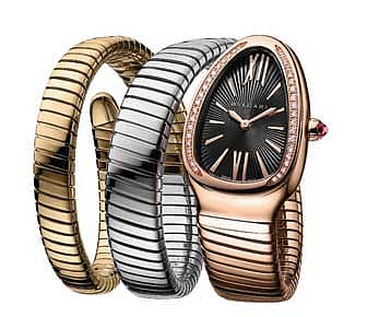 Bvlgari has introduced a Tubogas version combining the three classic gold colours: white, rose and yellow. This watch was a keenly anticipated comeback for an interpretation offering a contemporary take on the tricolour creations introduced in the 1960s by Bvlgari. The snake has become the cult theme of Bvlgari, with Tubogas as the House signature; Both blending to bring this exquisite piece to life. The watch, shaped like a snake head, is in rose gold and is accentuated by a setting of 38 diamonds and its winding crown is adorned with a cabochon-cut pink rubellite. The dial is elegantly attired with a black opaline base graced with a subtle guilloché motif and enhanced by rose gold hour-markers.