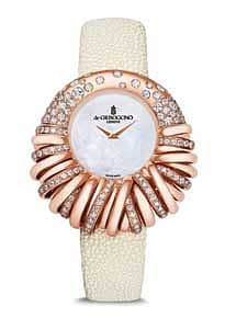 De Grisogono Allegra watch is now iconic to the brand and has earned a place among the greatest feminine timepieces. This timepiece forms an infinite circle, a woven gold ribbon graced with delicately interlacing circles elegantly created as a seamlessly flowing The watch has 29 polished or diamond-set rings entwined around the dial at 3 and 9 o’clock. The offset mother-of-pearl or diamond-pavé dial is the shimmering face of this jewellery timepiece combining the radiance of gold with 4.30 carats of snow-set and bezel-set gems. The watch binds to the wrist with De Grisogono’s signature galuchat strap.