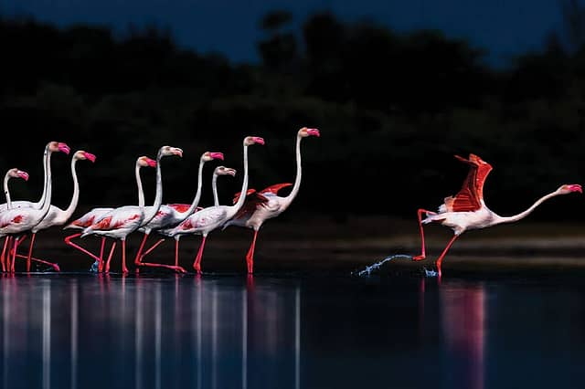 This 21sqkm protected area is set along the Palk Strait where it meets the Bay of Bengal at Point Calimere. The site is a mix of salt swamps, mangroves, backwaters, mudflats, grasslands and tropical dry evergreen forests. Created in 1967 to protect the blackbuck, the sanctuary is also famous for large congregations of waterbirds, especially greater flamingos. Notable animals include spotted deer, jackal, bonnet monkey, wild boar and monitor lizard. Bottlenose dolphins are frequently seen along the shore. The beaches are a regular nesting site of the Olive Ridley turtle. This sanctuary also hosts a large congregation of migratory waterbirds, with a peak population in excess of 100,000. The birds arrive each winter from as far as Siberia, Central Asia and parts of Europe, and include spot-billed pelican, Nordmann's greenshank, spoonbill sandpiper and black-necked stork. The sanctuary is also home to several land birds, like white-browed bulbul, Brahminy kite, small green-billed malkoha, crow pheasant, rose-ringed parakeet, blue-tailed bee-eater, etc.