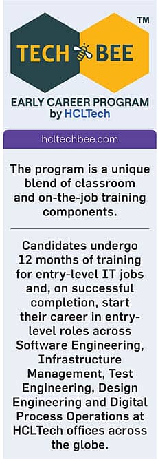 JOB ASSURANCE: This is an advantage no other course can offer. HCLTech offers this course to Class XII completed students and postcompletion of the program; the job opportunities are with HCLTech only. TechBee is an exclusive job program for individuals seeking full-time jobs after high school. Candidates undergo 12 months of training for entry-level IT jobs and, on successful completion, start their career in entry-level roles across Software Engineering, Infrastructure Management, Test Engineering, Design Engineering and Digital Process Operations at HCLTech offices across the globe.