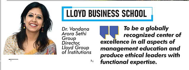 Lloyd Business School is a privately endowed, co-educational, modern-day frontline B-School approved by AICTE, Ministry of HRD, Government of India. Lloyd Business School runs a two-year full-time Post-Graduate Diploma in Management (PGDM) that is approved by AICTE, Ministry of HRD, GOI. Further, the dispense of the philosophical idea and foresee ability of management employment reflects in the unique design of management specializations' curriculum. Lloyd Business School has ensured an efficient industry amalgamation in delivering all management specializations. The Business Analytics specialization is developed in collaboration with analytics giant IBM, Supply Chain Management Specialization is designed in association with Safe Educate, BFS & I specialization is instigated in close association with NSE Academy and Human Resource Management specialization is knitted in consultation with Manpower Group. Lloyd Business School believes in providing additional skill-sets in the form of industry-oriented certifications. These certifications provide management graduates of Lloyd Business School a competitive edge when it comes to employability and sustainability in their careers. Lloyd Business School also contributes significantly to its social responsibilities of research and development. The intellectual capital of Lloyd Business School has a conspicuous contribution in social and management research. The Management Development Programs, Faculty Development Programmes and consulting projects carried at Lloyd Business School serve a great deal of learning for industry and academia. Lloyd Business School believes in raising the bar of knowledge acquisition and dissemination as excellence and knowledge are infinite.