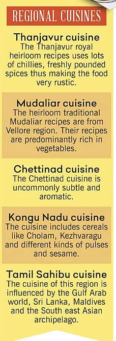 The Tamil regional cuisine is broadly categorised in to five regions – Thanjavur cuisine – Mudaliar cuisine – Chettinad cuisine – Kongu Nadu cuisine – Tamil Sahibu or Tamil Muslim cuisine