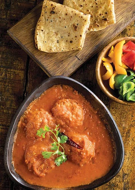 The Thanjavur royal heirloom recipes uses lots of chillies, freshly pounded spices thus making the Cuisinesfood very rustic. The mashyache kebab (pan-fried poppy seeds and green chilli-smeared fish fillets), komdiche kebab (chicken kebab with coriander, pepper and ginger), kesari maas (dry mutton mince with saffron and spices), kelyachi bhaji (raw banana tossed with karivadagam and hurit, a mixture made by roasting lentils, rice and sesame seeds and ground into a coarse powder) are a part of regular South Indian meal. But what makes the food of the Thanjavur royal kitchen so unique is the distinct and unmistakable influence of the Marathas.