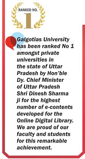 Continuing to thrive during the pandemic, Galgotias University was awarded the QS award for e-learning and also received recognition from the Deputy Chief Minister of Uttar Pradesh for ranking No.1 in providing e-content to the online digital library of the Government of Uttar Pradesh.