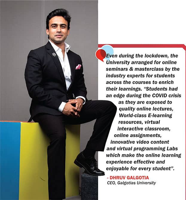 Even during the lockdown, the University arranged for online seminars & masterclass by the industry experts for students across the courses to enrich their learnings. Dhruv Galgotia, CEO Galgotias University explains, "Students had an edge during the COVID crisis as they are exposed to quality online lectures, World-class E-learning resources, virtual interactive classroom, online assignments, innovative video content and virtual programming Labs which make the online learning experience effective and enjoyable for every student". Viewing the challenges posed by the pandemic as opportunities, Galgotias University ensured zero academic loss apart from increased student engagement and enhanced learning amidst the COVID crisis.