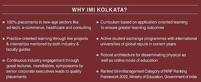 Being located strategically in the heart of Kolkata, the institute enjoys the vibes of the city of joy. IMI Kolkata embarks up on its world-class infra-structure, highly experienced faculty members and an industry focussed experiential learning after curricu-lum. The international linkage of the institute has grown over the years and spans across business schools/universities in North America, Eu-rope and Asia. The institute has maintained 100% quality placement track record since its inception.