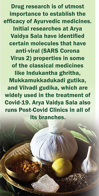 Drug research is of utmost importance to establish the efficacy of Ayurvedic medicines. Initial researches at Arya Vaidya Sala have identified certain molecules that have anti-viral (SARS Corona Virus 2) properties in some of