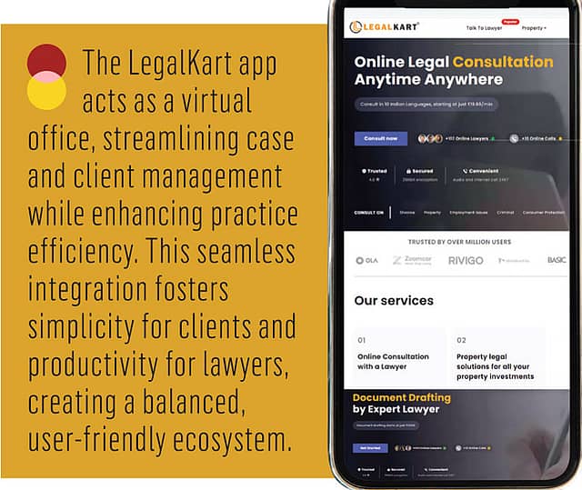 For lawyers, the LegalKart app acts as a virtual office, streamlining case and client management while enhancing practice efficiency. This seamless integration fosters simplicity for clients and productivity for lawyers, creating a balanced, userfriendly ecosystem.