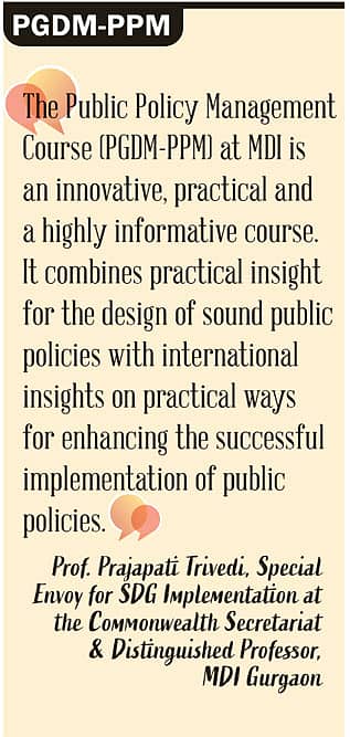 3. MDI-G's yet another prominent course is Post Graduate Diploma in Management – Public Policy and Management (PGDM-PPM). Since 2006, the AICTE approved, DoPT supported PGDM-PPM at MDI has constantly bridged the diverse experiences with evidence and expertise for cognitive gain, behavioural change, and citizen-centricity. The program is expected to develop comprehensive competency by integrating understanding, realization, and value judgment by aligning government vision with citizens' values. This is an 18-month programme, out of which 15 months will be at MDI Gurgaon, followed by three months for a Policy Paper, undertaken by the participants at the respective workplaces. With much pride, the institute finds this course's Alumni of 250 senior officers representing 22 Ministries/Organizations & State Governments. The participants are set to gain holistic understanding through a blend of theory and practice on public policy & governance, law, project management, public finance, infrastructure and sustainable development, economics, and leadership and human resources management. Know some key USPs of this course:
