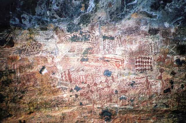 Just 8 kilometres to the east of the district headquarters of Raigarh lies Kabra Pahar, one of the most famous rock art sites in Chhattisgarh. The name means 'Spotted Mountain' and the site lies in Bhojpalli village. The rock art is at a foot of a large vertical cliff. Locals still conduct religious ceremonies here, most importantly around Holi. Geometric designs, human figures and a variety of animals are represented in the reddish-brown paintings, which reach up to a height of 6-8 metres. Some of the animals have decorated bodies and are a sight to behold. The paintings are in a better state of preservation.