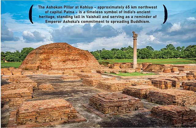 The Ashokan Pillar at Kohlua-approximately 65 km northwest of capital Patna-is a timeless symbol of India's ancient heritage, standing tall in Vaishali and serving as a reminder of Emperor Ashoka's commitment to spreading Buddhism. The pillar stands next to a brick stupa and commemorates Buddha's last sermon. Found in an excavation, it has a life-size figure of a lion on top. Excavations have also revealed many other articles related to Buddhism. The pillar is made of a highly polished single piece of red sandstone, surmounted by a bell-shaped capital, 18.3 m high. There is a small tank here known as Ramkund.