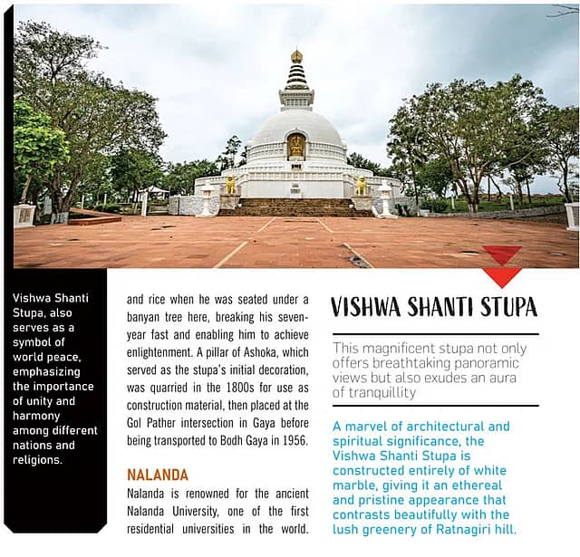 Bihar stands as a timeless destination, embracing both its past and the continuous flow of visitors who come in search of enlightenment and cultural enrichment. It is home to two UNESCO World Heritage Sites, both associated with Buddhism. These are the Mahabodhi Mahavihara in Bodh Gaya and the ruins of the former Nalanda University. Besides that, the Government of Bihar has recommended that the Cyclopean Wall of Rajgir also be declared a UNSECO World Heritage Site.