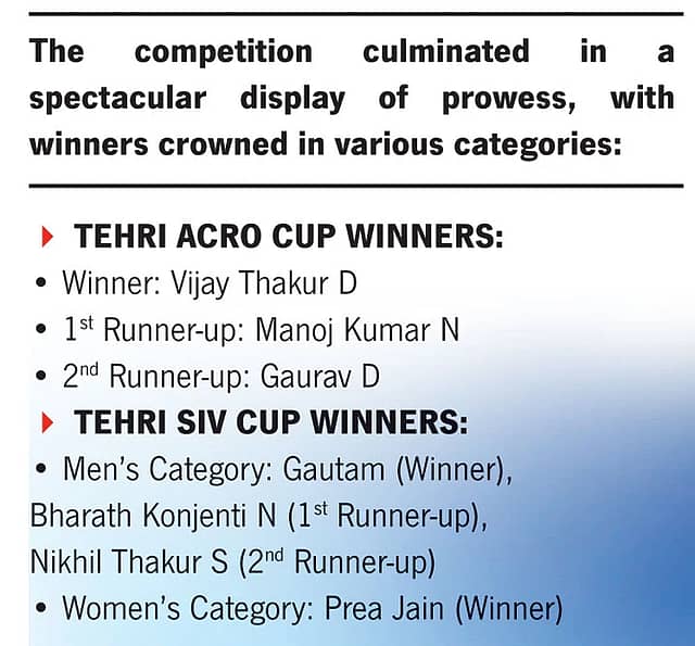 Colonel Ashvini Pundir, Additional Chief Executive Officer (Adventure), UTDB, distributed the prizes. Col Pundir stated that the event's success solidified Uttarakhand's standing as a major participant in adventure tourism globally. He also talked extensively about the state government's initiatives to turn Tehri into a centre for adventure sports, with everything from paragliding to kayaking available for adventure enthusiasts.