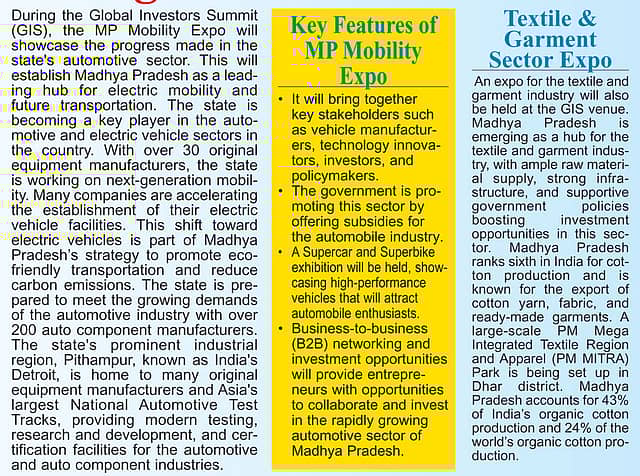 To make the Global Investors Summit (GIS) more attractive, the government is organizing three major expos in the 250-acre area in Bhopal. These expos are being organized keeping in mind the needs of the citizens, as well as the growing industries in Bhopal and surrounding areas. The most attractive among these will be the Mobility Expo, featuring supercars and superbikes, which are sure to attract the youth. Additionally, a Textile and Garment Expo will be held, focusing on the business sector and middle-class needs. The government has also decided to include the One District One Product (ODOP) scheme, which highlights the unique products of each district, in these expos.