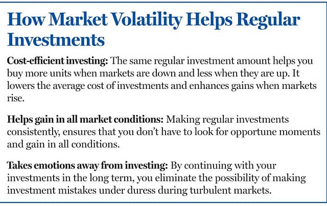 It is not just the historical evidence of long term growth of equities that should encourage investors to stay invested in the market-oriented investments. Market turbulence helps those making regular investments benefit from market volatility. This is more so for those investing regularly in equity markets through regular investment facilities such as systematic investment plans (SIPs) offered by mutual funds. Here's how.