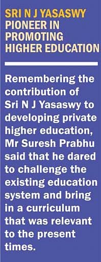 Talking about the role of education, Mr Suresh Prabhu said that education is necessary to develop as an individual, discover oneself, and realize one's potential. He emphasized the role played by quality education and outcomes-oriented education. He said that the long-term sustenance of democratic society depends on strong institutions and individuals committed to institutions and institutional building. Remembering the contribution of Sri N J Yasaswy to developing private higher education, Mr Suresh Prabhu said that he dared to challenge the existing education system and bring in a curriculum that was relevant to the present times.