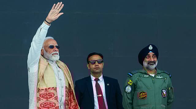 Prime Minister Narendra Modi witnesses the aerial display of fighters, transport aircraft and helicopters, in Dibrugarh on Saturday. Assam Chief Minister Himanta Biswa Sarma and Chief of the Air Staff (CAS) Air Chief Marshal Amar Preet Singh also present. Credits: ANI