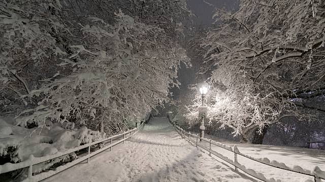 Snow covered views of Central Park after midnight as the city braces for a blizzard on Sunday into Monday on February 23, 2026 in New York City. New York City Mayor Zohran Mamdani announced a state of emergency for New York City and issued a travel ban beginning at 9 p.m. tonight, and ending at 12 p.m. on Monday. New York City could get more than a foot of snow with up to two feet on Long Island and in parts of New Jersey. Credits: Getty images