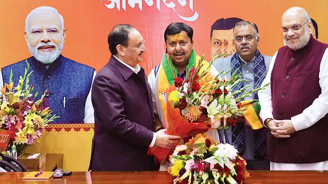 Overnight, posters of Nabin, along with Modi and party president JP Nadda, sprung up in the capital, lining the road leading to the party headquarters on Deendayal Upadhyay Marg where Nabin was to reach the morning after the announcement. With his flight from Patna delayed because of dense fog and low visibility in Delhi, he made it to the BJP office only by afternoon, wearing a white kurta-pyjama, a striped Nehru jacket, and a saffron scarf with a lotus, the party symbol, looking the quintessential BJP politician. After making his way through the crowd of party workers and assembled media, Nabin was felicitated in the presence of senior leaders, including Shah and Nadda.